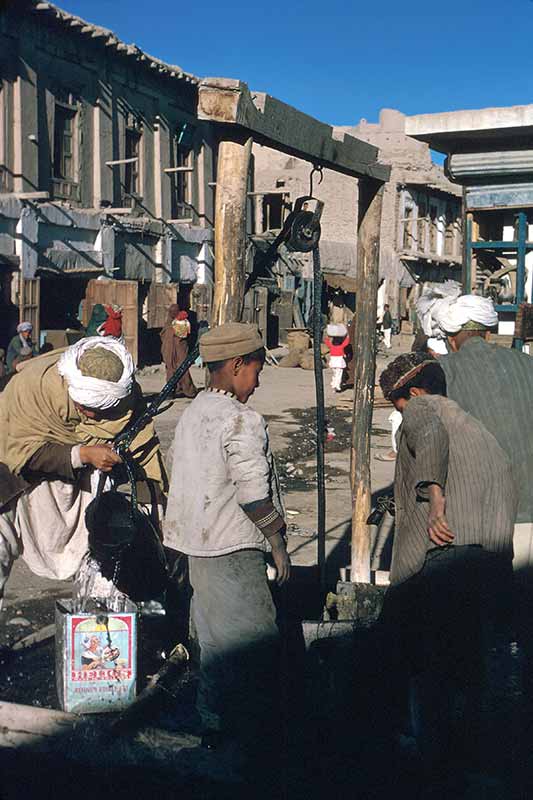 Men fetching water from a well on a street in the town of Ghazni, eastern Afghanistan.