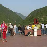 A road runs from Shkodra, alongside Liqeni i Vaut të Dejës, an artificial lake created by a dam 18 kilometres from the city, to the massive Vau i Dejës dam, built between 1967 and 1971. The complex has four hydroelectric turbines, producing 600 Megawatts in an underground power station. The road leads through a 3 kilometres long tunnel and ends at the ferry station of Koman. From here, ferries run on Liqeni i Komanit, an artificial lake on the Drin river, to the village of Bregluma. The vessel can take about 20 cars and 100 passengers and takes about four hours to make the journey. There is also a small boat that takes only passengers, looking more like a bus, with the driver indeed steering it with a steering wheel. They can be dropped off at points along the river, from where they have to climb to their villages in the surrounding mountains. The journey from Koman to Bregluma is breathtakingly beautiful, passing through artificial lakes and deep gorges that remind of Norwegian fjords. Passengers are dropped at various villages along the way.