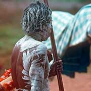 Funerals are very important in the lives of the people of Arnhem Land and involve ceremonies where ritual dances take place; people are painted with white clay as a sign of mourning and men perform ceremonies, brandishing spears, as among the Djambarrpuyngu speaking Yolngu people of Galiwin'ku (Elcho Island). Mourning may take several weeks. In the old days bodies were laid on raised platforms, the bones later collected and placed in log coffins; nowadays Christian burials are carried out, but traditional ceremonies are still performed as well.