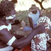 The Yanyuwa people, living in and around the town of Borroloola near the southern shores of the Gulf of Carpentaria, are made up of four clan groups in two moieties. The Yalkawaru ceremony, associated with "Ngabaya" (Plains Kangaroo) Dreaming is owned and performed by members of the Wurdaliya and Wuyaliya clans while the Kulyukulyu ceremony, representing the Dreaming of the Brolga, is owned and performed by the Mambaliya/Wawukarriya and Rrumburriya clans. In both ceremonies men and boys are painted with designs in white and decorated with tufts of cottonwool, nowadays glued onto the body with sugar water. The "kujika" or song cycle, describing the travels and deeds of the Dreaming being is sung and danced over a number of days. During the Yalkawaru ceremony, paperbark headdresses are worn and the ceremony finishes around a decorated pole, representing the deceased. The Yalkawaru ceremony involves young men and boys personifying the mythical Brolga, their heads plastered with clay and cotton wool.