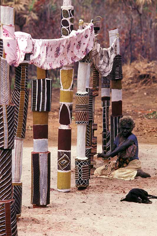 Decorated poles at a “Pukumani” funerary ceremony in Pularumpi (Pirlingimpi), on Melville Island. These carved and painted “Pukumani poles” are commissioned by the family of the deceased and used to be placed around the grave, typical of the people living on the Tiwi islands.