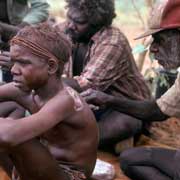 The boys, usually aged between around 12 to 16 years, are taken from their mothers and painted all over with red ochre; a belt, made of woven strands of human hair is tied around their waists and they traditionally are taken on a journey to different communities, gathering people to participate in the rituals; or they may undergo those rituals over there. The women dance and often wail as the child will be lost, returning later as a man. The men perform various ceremonial dances associated with the dreamings belonging to the subsection of the boys; these may not be observed by women and children. The boys are taken into the bush to be shown a series of very secret-sacred ceremonies, but return to the general camp where they are kept in seclusion, only visited by men and boys. A number of all-night ceremonies are performed; some of these can be seen by all and, indeed, young boys are painted with white clay and join the initiates, jumping over a small fire and sometimes tossed into the air "to make them strong". But later into the night the initiates will be decorated with vegetable down and are made to sit on their knees, resting on their elbows, only getting up when sacred rituals are shown to them; women and children keep their heads covered then.