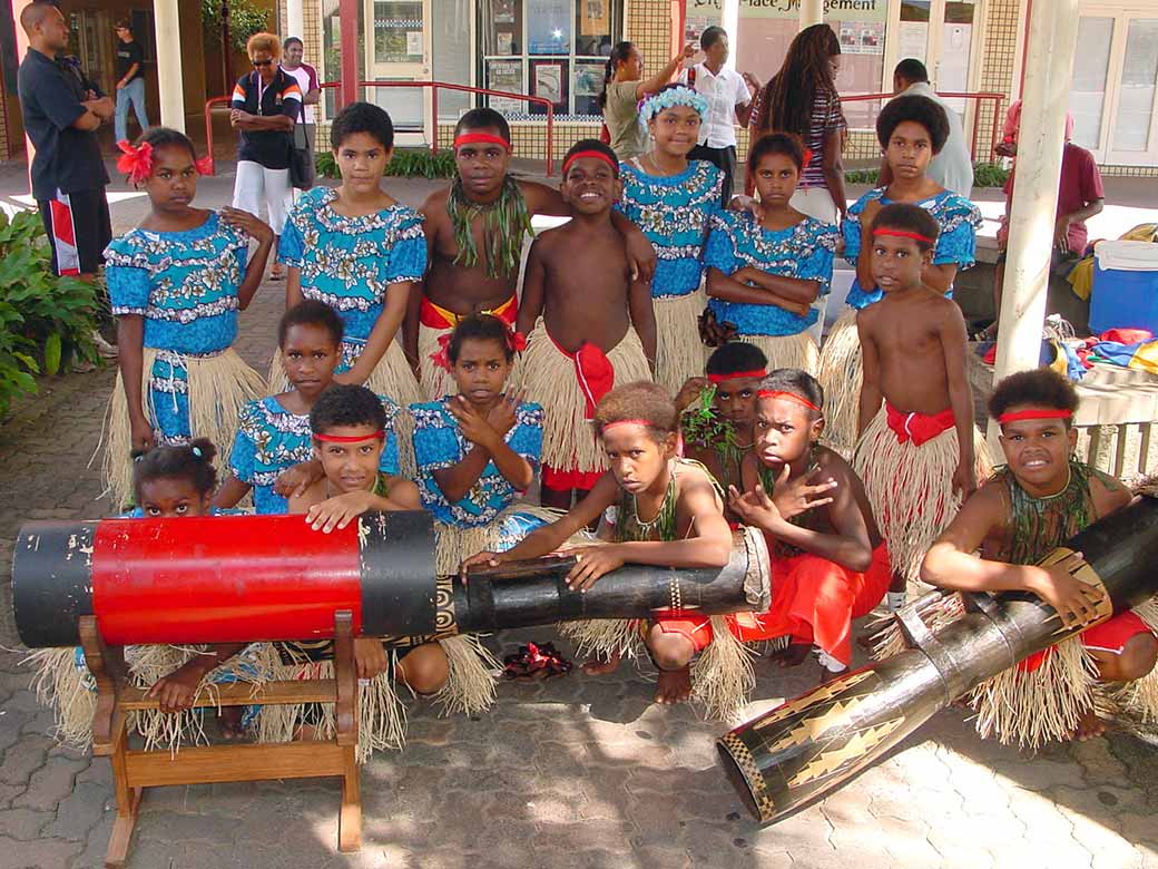 The Junior Torres Strait Islander dance group of Djarragun College pose after their performance at the Sound Shell in Cairns during School Cultural Week.