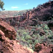 Eighteen kilometres south of Hermannsburg, along a sandy track that mostly follows the dry riverbed of the Finke River, is Palm Valley, that had impressed Ernest Giles back in 1872 and still does the same to present day visitors. The valley is actually a narrow gorge with stands of red cabbage palms (Livistona mariae), some reaching as high as 25 metres. This species is unique to this area and found nowhere else. The gorge has over 300 plant species and is a true oasis in this otherwise dry land. On the way to Palm Valley one comes through the Amphitheatre, also called Kalarranga, a group of red sandstone formations in an impressive setting, especially striking after sunrise and in late afternoon.