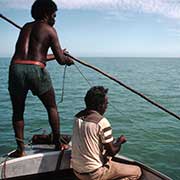 On the coast, hunting is done at sea, where catching dugong (a sea mammal) and the green sea-turtle are especially important. A hand-held harpoon with detachable points is used and it requires great skill, from an open boat (nowadays aluminium dinghies with outboard motors); for the people of the Gulf of Carpentaria there is great ceremonial meaning in this. Spears are also used in Arnhem Land to catch fish and freshwater crocodiles but goannas are caught by hand or brought down with sticks after they've fled in a tree. Goannas, the large monitor lizards, are caught by hand and are highly prized.