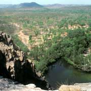 The beautiful falls at Gunlom at Waterfall Creek Nature Park in the south west were formerly known as UDP Falls (UDP stood for Uranium Development Project, there was a, now disused, mine nearby) and is on a tributary of the South Alligator River in the south of Kakadu National Park. A scene from the movie "Crocodile Dundee" was shot here. It is a fantastic spot with great swimming and beautiful views from the top. More difficult to reach are Jim Jim and Twin Falls, at the end of a 50 to 60 kilometres rough bush track. The falls can be reached by four-wheel drive vehicle, but only in the Dry season when the falls don't flow; when they do flow, in the wet season, they are inaccessible by road and can only be seen by helicopter.