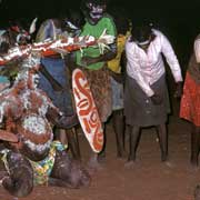 An example of a ceremony in which the whole community participates at all times is the "Ngajakula" ceremony. In this ceremony, taking place nightly over many weeks, men of the moiety to which the "skin groups" Japangardi, Japanangka, Japaljarri and Jungarrayi belong, perform dances and sing the chants relating to particular mythical "dreamtime" beings and the deeds they did in the mythological past at certain points along the "dreaming track" those beings followed. These men are called "kirda". the "owners" of the ceremony. The men are painted with designs on their backs, relating to those particular "Jukurrpa" or "dreamings"; they dance with wooden shields (called "kurdiji") on which the same designs have been painted, usually with white dots on a red ochre background; sometimes those designs are glued on with "wamurlu", a kind of wild cotton, coloured with red ochre and white clay. In some rituals a "mangaya" is used, a ceremonial object made from twigs bound together with hair string and decorated with this "wamurlu" vegetable down. Women of the opposite moiety (belonging to the "skin groups" Nampijinpa, Nangala, Nakamarra and Napurrula) dance behind the main actors; they carry wooden "nulla nullas", heavy fighting sticks (called "kuturu"), also painted and decorated.