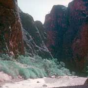 Although the Aborigines lived in this region for generations, Purnululu was “discovered” only in the mid-1980s. A television crew came upon the unique beehive-shaped domes in 1982; in 1987, it was proclaimed a National Park. Geologists tell us that 350 million years ago, a significant marine deposit was formed during the Devonian Era; it eroded the present structure of domes, cliffs, and gorges by the hundreds of millions of wet seasons. Somewhat fragile, the orange bands on the rocks are silica, but the black bands are lichen, overlaying the white sandstone core. There are unique plants here, like a species of Livingstonia palm that has nowhere else been found.