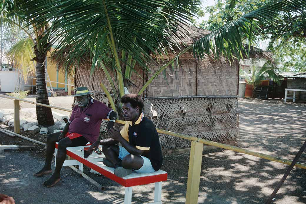Two men taking it easy on Boigu Island, just south of Papua New Guinea. The traditional palm leaf house behind them proves that crafts and culture is still very much alive.
