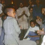 There are frequent festivals on the liturgical calendar, like this Festival of the Virgin Mary. In magnificent robes and holding staffs and crosses, five priests walk around the inner corridor. Six acolytes attend them: young boys, dressed in robes with silver ornaments and carrying colourful umbrellas as a sign of honour to the priests, the bishop and sacred objects. At every corner, they bow and sing in Ge’ez, Ethiopia’s liturgical language. Meanwhile, in another room, around 50 turbaned priests and monks sing and dance, accompanied by two large “Kabaro” drums, “tsinatseil” (sistrum), a rattle, which has small metal disks loosely suspended on rods, and the clapping of hands: a very lively performance. Later, while a boy acolyte plays the accordion, three priests, each wearing a large silver crown, bring a large Bible from the Holy of Holies.