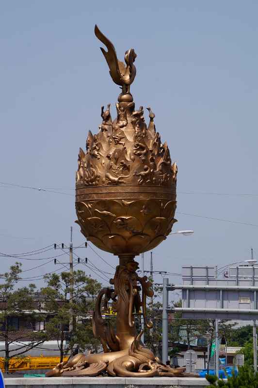 The large model of the Baekje-era incense burner on a traffic roundabout in Buyeo.