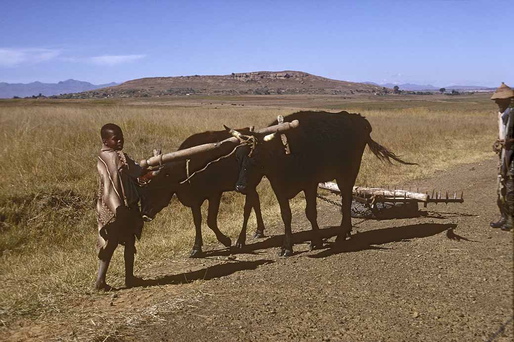 A farmer and his son with their oxen-drawn sledge between Butha Buthe and Hlotse in the north of the country.