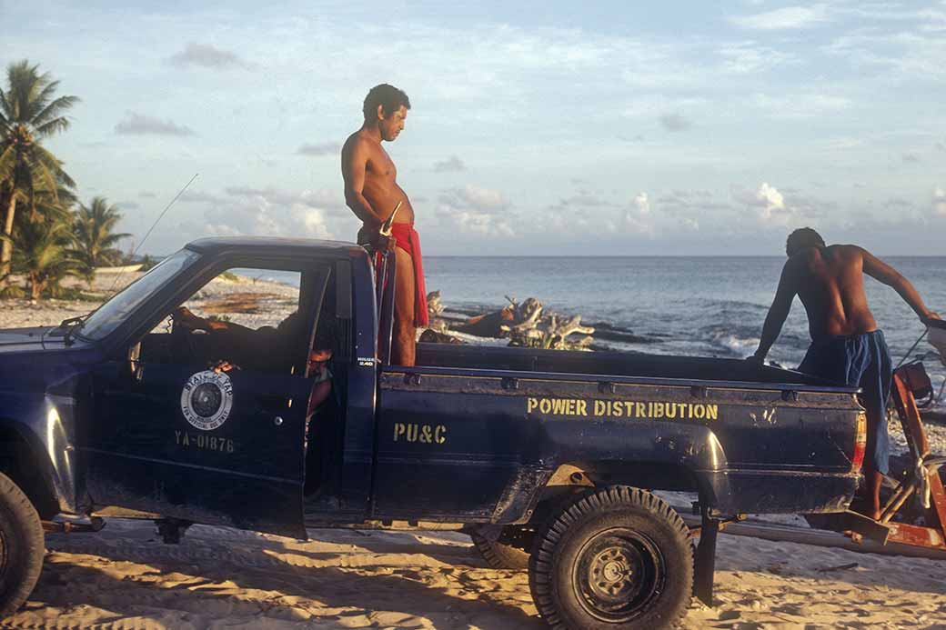 Pulling a boat out of the water of the lagoon on the beach of Falalop.
