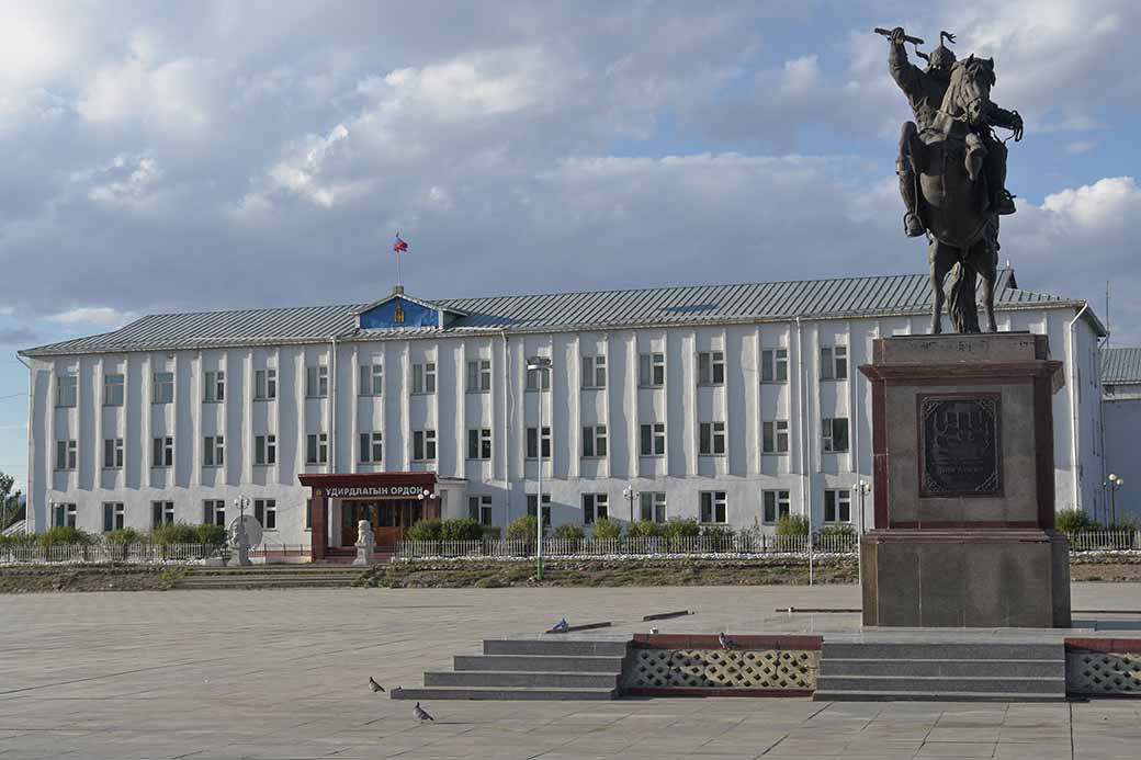 The Government House in Mörön with a memorial to honour Marshal Chingünjav, 1710–1757, one of the two major leaders of the 1755-1756 rebellion in Outer Mongolia. Although his rebellion failed, he is nowadays often hailed as a fighter for Mongolia's independence from the Manchu, who were ruling China at that time. Chingünjav's Memorial statue was erected in 2010.