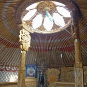 The beautifully carved roof wheel (toono) and the poles resting on carved elephants and turtles, holding up the ceremonial ger, at the Ethnography Museum of Öndörkhaan, Kentii province.