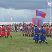 Participants present themselves for the traditional Mongolian wrestling matches, known as Bökh (meaning “durability”), under the National flag.
