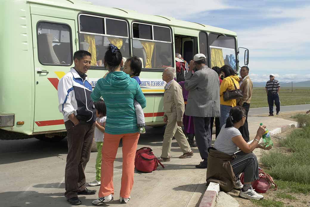 Passengers having a break on the bus journey from Ulaanbaatar heading east.