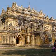 There are some ruined stupas in what was the Royal capital of Inwa (Ava), and the old teak monastery of Bagaya Kyaung, dating from 1834, that has survived the 1839 earthquake. The ornately carved brick and stucco Maha Aungmye Bonzan monastery, built in 1822, was badly damaged in the earthquake but restored in 1872. Amarapura has its famous 1.2 kilometre long teak U Bein's foot bridge across Taungthaman Lake but not much else, as King Mindon, who in 1857 started to build the new capital of Mandalay, 11 kilometres north of Amarapura, had decided to reuse as much materials as possible from Amarapura, his treasury being depleted after the Second Burmese War. The palace buildings were dismantled and moved by elephant to the new location and the city walls were pulled down for use as building materials for roads and railways. On 23 May 1857 Amarapura officially ceased being the capital.