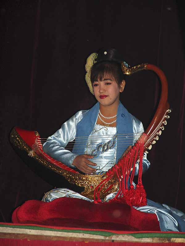 A woman plays a “saung gauq” or Burmese harp at the Marionettes and Culture Show in Mandalay. It has sixteen strings and is made in the form of a boat. The boat-shape hollow base or body of the harp is made of the finest padauk (pterocarpus) wood, the neck is made of acia catechu wood, and the drum of deerskin. It is played by plucking with the fingers.