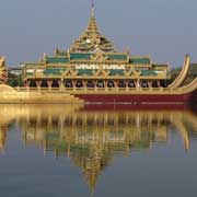 The Karaweik, a reinforced concrete reproduction of a royal barge at a small park on Kandawgyi Lake. It was designed by Burmese architect U Ngwe Hlaing and built from June 1972 and October 1974.