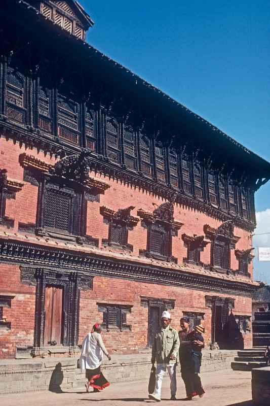 The Palace of Fifty-Five Windows to the right of the Golden Gate, Bhaktapur Durbar Square. The palace was completed in 1754; a huge amount of damage was done to the complex during an earthquake in 1934 and more damage was done in the 2015 earthquake.