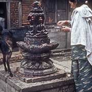A woman bringing an offer at a shrine in a street, dubbed “Pig Alley” by travellers, in central Kathmandu, arount Maru Hiti, west of Durbar Square.