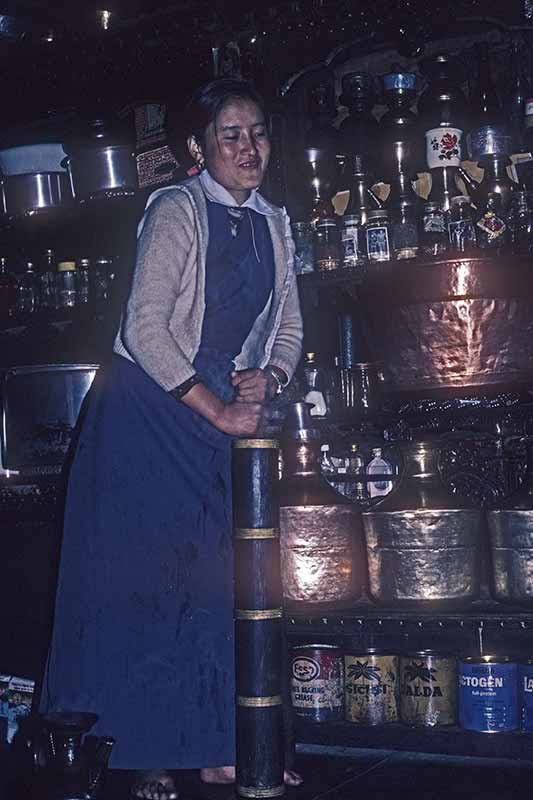 Pasang, Thopten Lama's wife, churning Tibetan butter tea, at home in Tarke Ghyang.