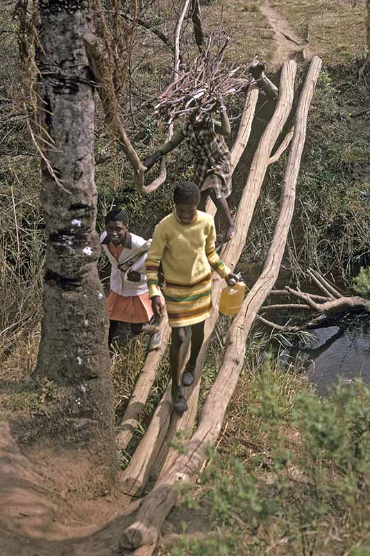 Girls cross a bridge made from tree trunks near the lake at Mantjolo, near Mbabane.