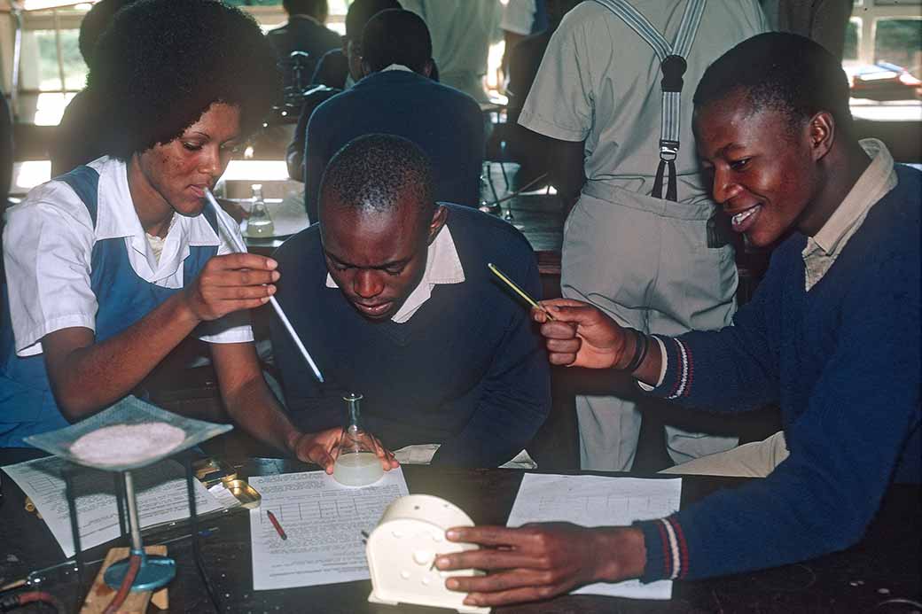 Form 4 students Chloe Leibbrandt, Raphael Hlophe and Joseph Khumalo doing measurements in the school laboratory.