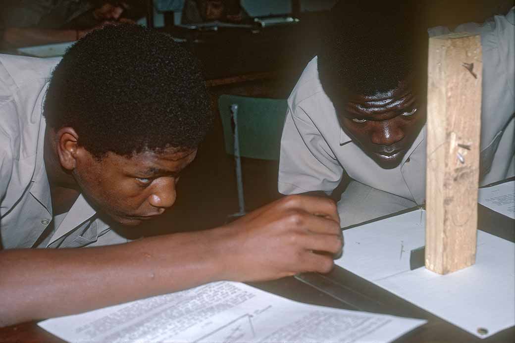 Form 3B students Basil Munro and Eric Dlamini doing measurements on the reflection of light during a science lesson.