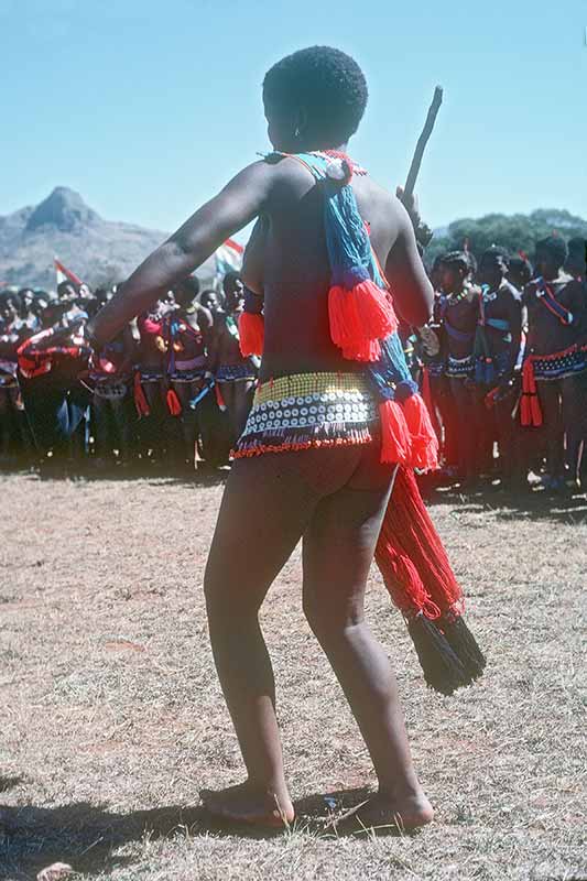 A young girl, wearing the “indlamu” bead skirt, dances outside the Somhlolo stadium in Lobamba before going in for the big dance, when they will celebrate the end of their “uMcwasho” period.