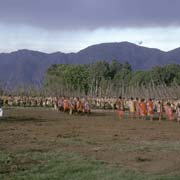 Early in the morning on the Main Day the King performs rituals in the enclosure and at its climax eats of the First Fruits. That day almost the whole nation comes to the Royal capital of Lobamba where in the huge "sibaya" or cattle enclosure the ceremonies are held. People will now be dressed in full iNcwala costume, which includes, for the men, a "siketja", a kind of cloak made from horse tails. The "emabutfo" or traditional Swazi regiments march in, singing as they go. In Lobamba there are various "emalawu", enclosures of different regiments or age-grade groups, each with traditional grass beehive huts, where they can stay. The Regiment of His Majesty King Sobhuza II was the Balondolozi regiment, the most senior; the next in seniority (age grade) was the Emasotsha regiment. The men are getting ready, some donning headdresses of black feathers of the "sakabula" bird.