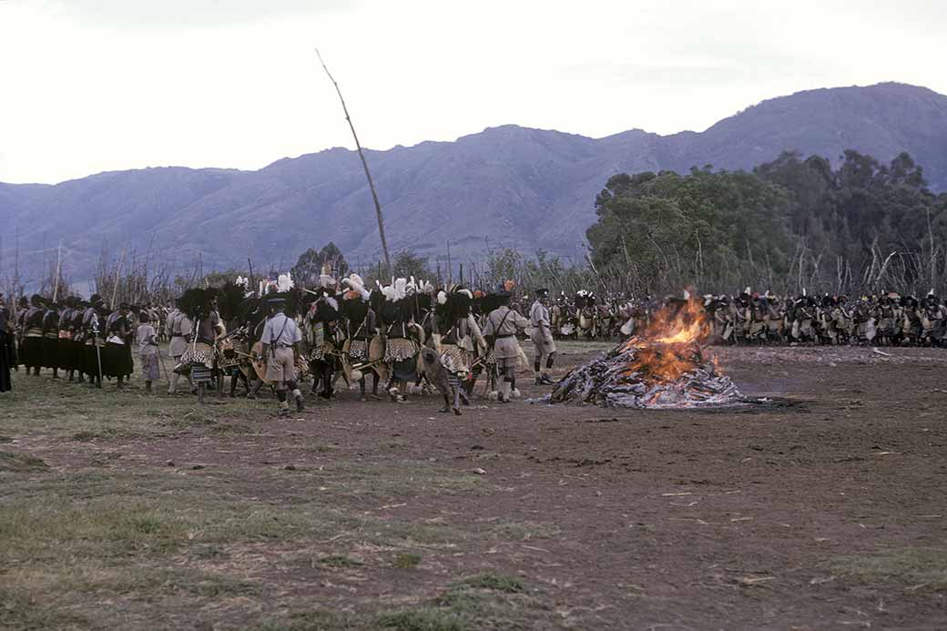 His Majesty King Sobhuza II with members of his “Balondolozi” regiment (and police) has emerged from the “inhlambelo” enclosure and joins the other “emabutfo” regiments to dance on the last day (“Lukhuni”) of the iNcwala ceremony in Lobamba. The pyre that was lighted by the King is supposed to be extinguished by rain at the end of the ceremony; it usually is!