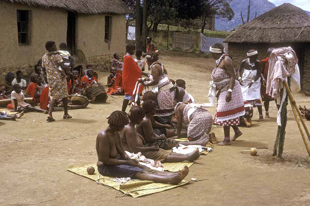 Newly qualified “tangoma” line up to undergo a “kufemba” ritual by the senior tangoma, in which evil spirit bodies, that may reside inside their bodies, will be “smelled out” in a final act of their graduation.