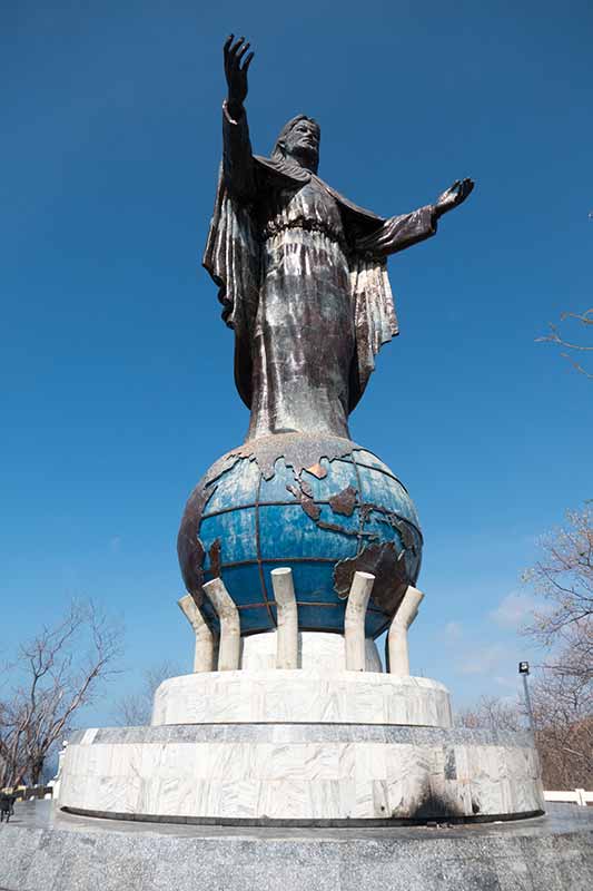 Cristo Rei of Dili, the statue of Christ, designed by Mochamad Syailillah and produced in Indonesia. It stands on a globe on which can be reached by climbing some 597 steps. It was unveiled by Soeharto in 1988 and the monument (statue, globe and pedestal) is 27 metres high, a reference to the integration of East Timor as the 27th province of Indonesia at that time.
