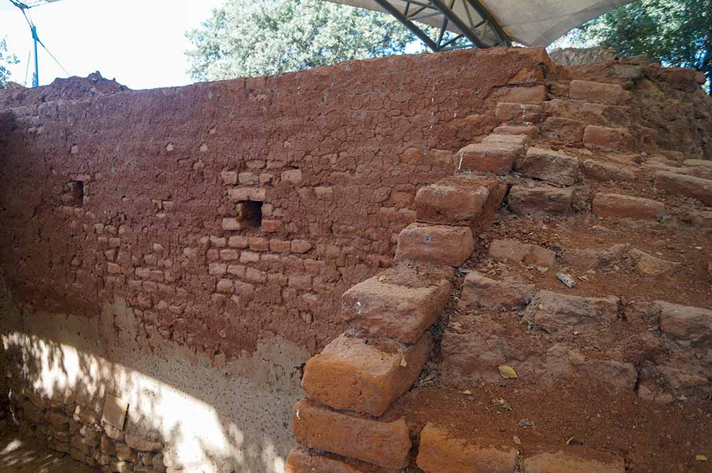 The Megaron, a structure with a front porch, of mudbrick masonry upon stone foundations, of Troia II-III; it was discovered during excavations of 1998-1999 and a protective roof, with the same height as the original Hisarlık mound before excavations began in 1874, has been constructed over it.