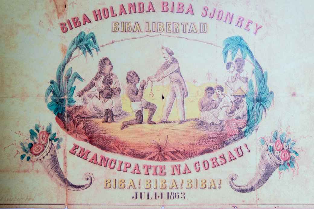 Proclamation in Papiamentu celebrating the abolition of slavery in Curaçao in July 1863, with the heading “Long Live Holland, the King and Freedom” in Landhuis Knip, a country house dating from the beginning of the 18th century. In 1875 there were still 175 slave huts and five stone buildings that housed 390 people.
