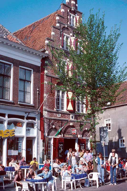 De Blauwe Hand (The Blue Hand) is a popular cafe with outside seating when the weather is good. It is at the Grote Bredeplaats, on the corner with the Vismarkt and housed in a warehouse with a characteristic steeped gable, dating from 1647.
